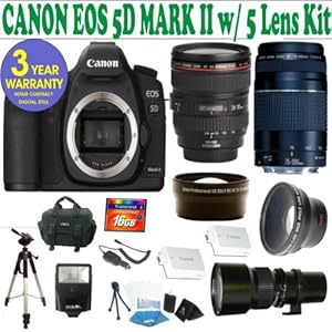 Best Prices BRAND NEW CANON EOS 5D MARK II w/ CANON 24-105 L LENS + CANON 75-300 ZOOM LENS + .45X WIDE ANGLE LENS + 2X TELEPHOTO LENS + 16GB HIGH SPEED MEMORY CARD CLASS 10 + 3 YEAR CELLTIME WARRANTY